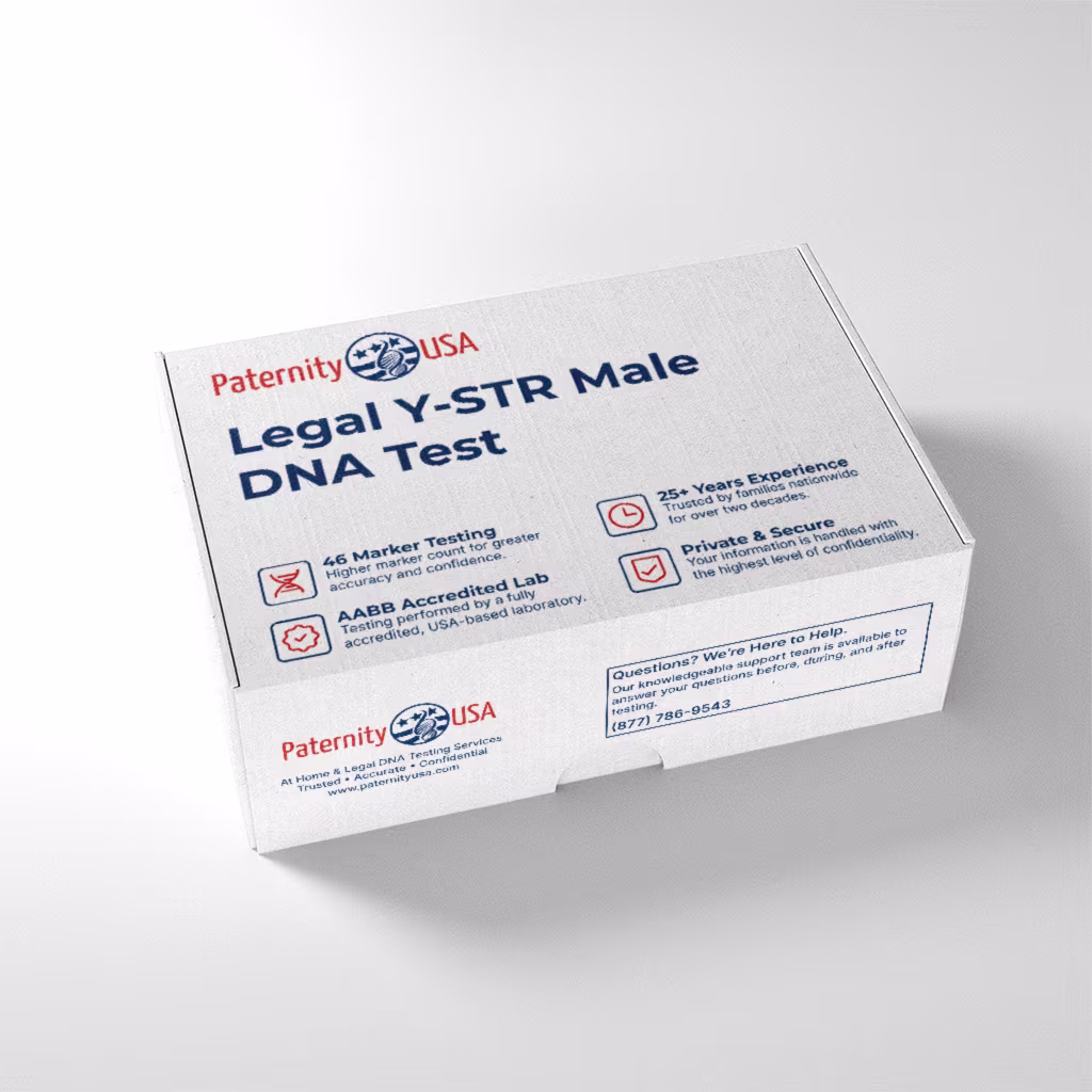 The Legal Y-STR DNA Test determines whether two males share the same paternal lineage, with results that are court-admissible in all 50 states. Testing is performed by an AABB-accredited U.S. laboratory using a secure chain-of-custody process to ensure accurate and legally valid results.